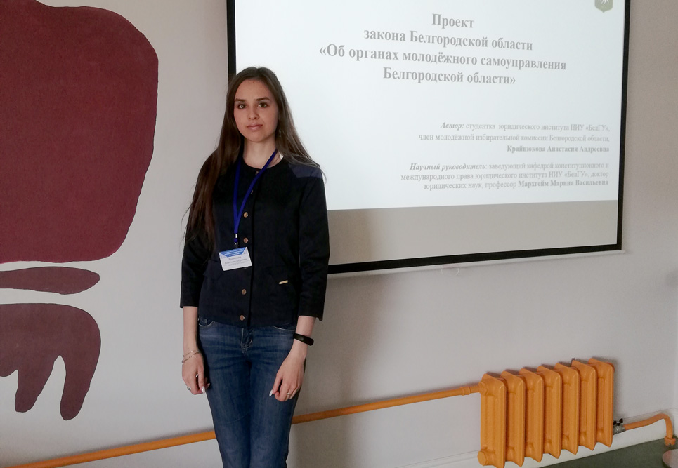 Студентка 3 курса юридического института Анастасия Крайнюкова под руководством заведующей кафедрой конституционного и международного права НИУ «БелГУ» Марины Мархгейм представила научную работу на тему «Проект закона Белгородской области «Об органах молодёжного самоуправления Белгородской области». Законопроектом предложено установить цели, принципы и правовой статус органов молодёжного самоуправления в регионе.