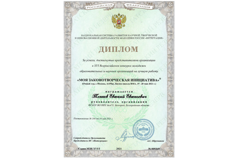 Для справки: Учредителями и организаторами XVI Всероссийского конкурса молодёжи образовательных и научных организаций на лучшую работу «Моя законотворческая инициатива» выступили Государственная Дума Российской Федерации и Общероссийская общественная организация «Национальная система развития научной, творческой и инновационной деятельности молодёжи России «Интеграция».