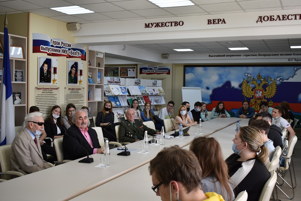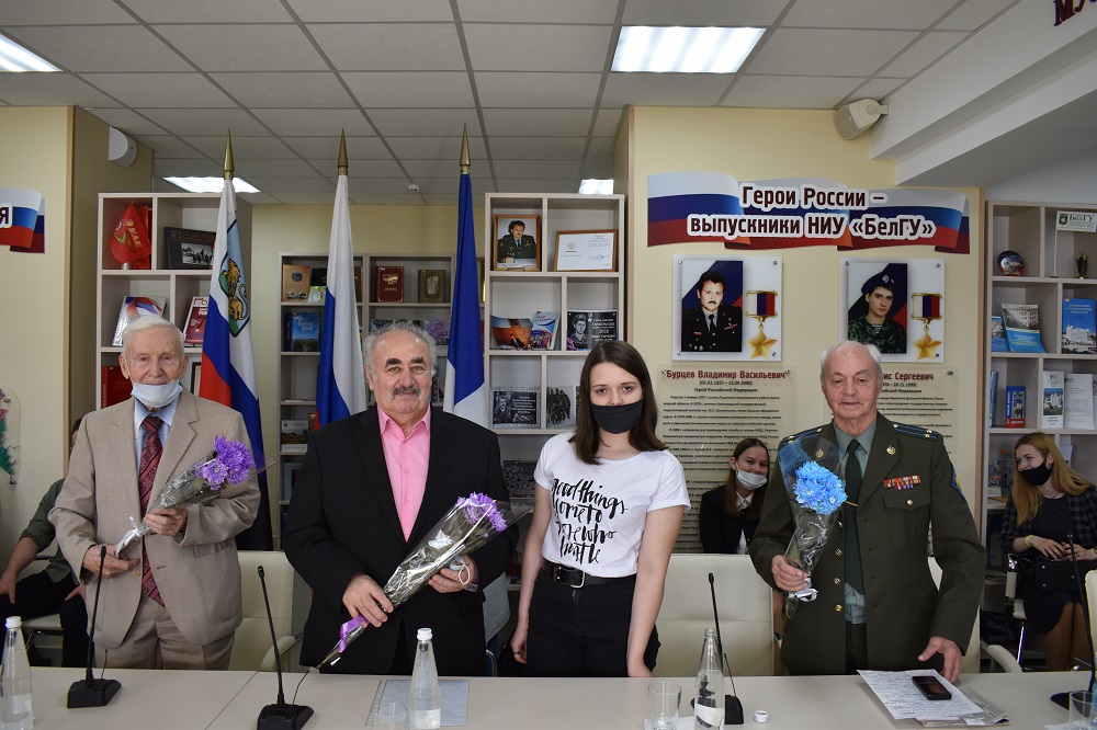 Председатель Совета ветеранов войны и труда НИУ «БелГУ» Юрий Никитович Питинов подчеркнул важность и актуальность подобных мероприятий. Участник Великой Отечественной войны, почётный профессор НИУ «БелГУ», ректор Белгородского государственного педагогического института им. М.С. Ольминского с 1974 по 1986 годы Пётр Григорьевич Коняев поделился воспоминаниями о событиях той страшной войны и рассказал, как развивался университет в период его трудовой деятельности, а активист ветеранского движения, член Союза журналистов России Виталий Васильевич Зубков – автор 14 книг гражданско-патриотической направленности и более 100 поэтических произведений – прочёл ряд стихов и представил героев своих книг – капитана I ранга, бывшего командира атомной подводной лодки «Карелия» Андрея Петровича Бескоровайного и генерал-лейтенанта, бывшего начальника Семипалатинского ядерного полигона Юрия Владимировича Коноваленко. Почётные гости поделились с участниками встречи уникальными воспоминаниями, а также фото и видеодокументами о периоде службы в вооруженных силах России.