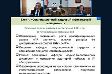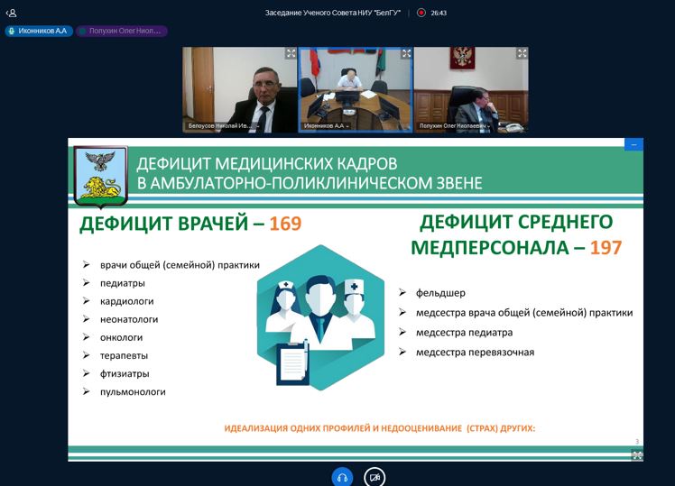 О промежуточных итогах программы развития медицинского института на 2019-2022 гг. и задачах на текущий период рассказал директор Николай Белоусов. Он отметил, что институт достиг положительных результатов в образовательной, научно-исследовательской, инновационной, международной деятельности и оказал существенную практическую помощь в борьбе с пандемией COVID-19 населению Белгородской области. Николай Иванович акцентировал внимание на образовательных программах и преподавательском составе, отметив, что сегодня студентов обучают 7 академиков и членов-корреспондентов РАН, 71 доктор наук, 158 кандидатов наук. Приоритетной задачей на 2021 год директор мединститута обозначил дальнейшее развитие практико-ориентированного обучения, в том числе с использованием телемедицинских и симуляционных технологий. В рамках данного направления он анонсировал открытие на базе института гистологической лаборатории, кафедры педиатрической хирургии и педиатрического факультета. Заострил Н.И. Белоусов внимание и на повышении взаимодействия с практическим здравоохранением по подготовке обучающихся на клинических базах и ориентации их на трудоустройство в медучреждениях Белгородской области в соответствии с потребностями на местах. В этом его поддержал содокладчик – начальник департамента здравоохранения Белгородской области Андрей Иконников, обозначив, что в правительстве региона вопрос восполнения кадрового дефицита с перспективой на будущее и проработкой мер поддержки медиков – один из наиболее приоритетных на сегодняшний день.