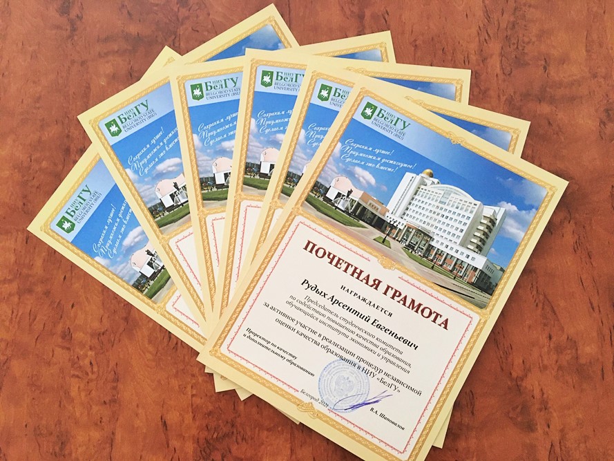 За активное участие в реализации процедур независимой оценки качества подготовки обучающихся почётными грамотами награждены студенты института экономики и управления: председатель студенческого комитета по содействию повышению качества образования Арсентий Рудых и члены комитета Алексей Полянский, Сергей Медведев, Юлия Галкина, Александр Язиков, Алина Чернова, а также студентка института инженерных и цифровых технологий, член студенческого комитета Дарья Громашова.