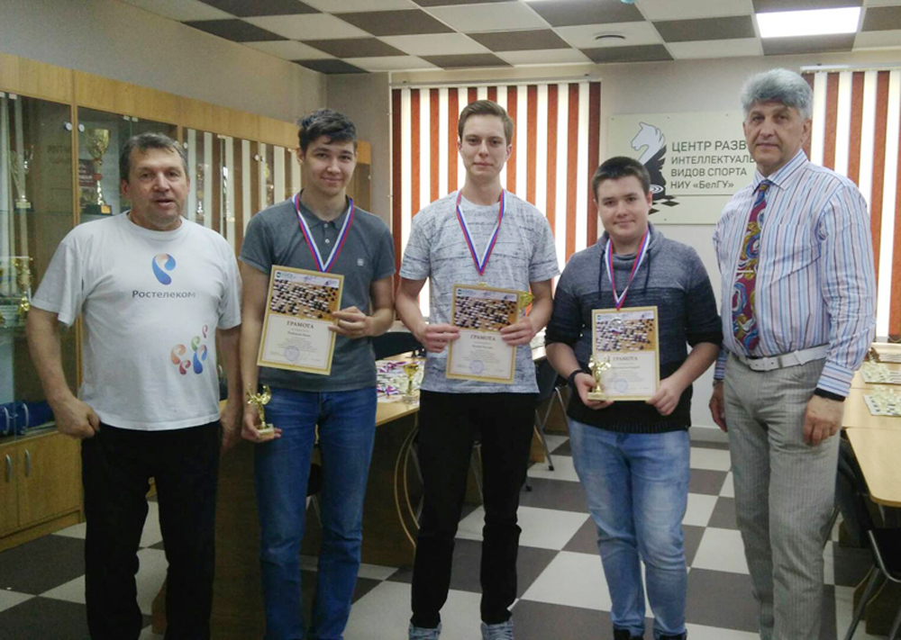 В мужском турнире первенствовал Руслан Кукин (студент факультета физической культуры педагогического института), на втором месте Андрей Шалопутов (инжиниринговый колледж), третье место разделили директор Центра развития интеллектуальных видов спорта Александр Иванов (лучший результат среди преподавателей и сотрудников) и Павел Науменко (тренер СШ Белгородского района по шахматам).
