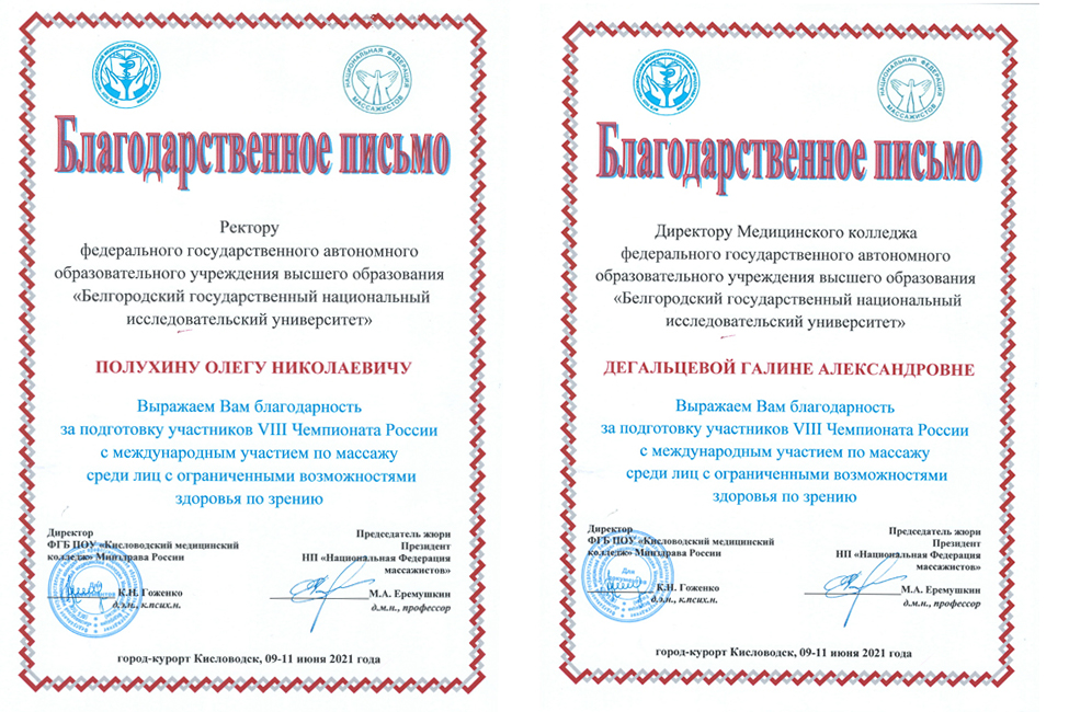 При подведении итогов Чемпионата председатель жюри президент НП «Национальная Федерация массажистов», д.м.н., профессор Михаил Еремушкин отметил высокий уровень подготовки участников от Белгородского госуниверситета и пожелал студентам дальнейших профессиональных побед и свершений. Тренер команды, преподаватель медицинского колледжа Владимир Пушкарев был награжден благодарственным письмом за подготовку участников Чемпионата.