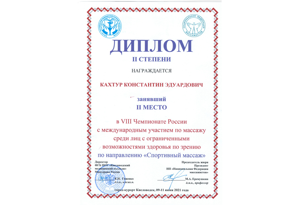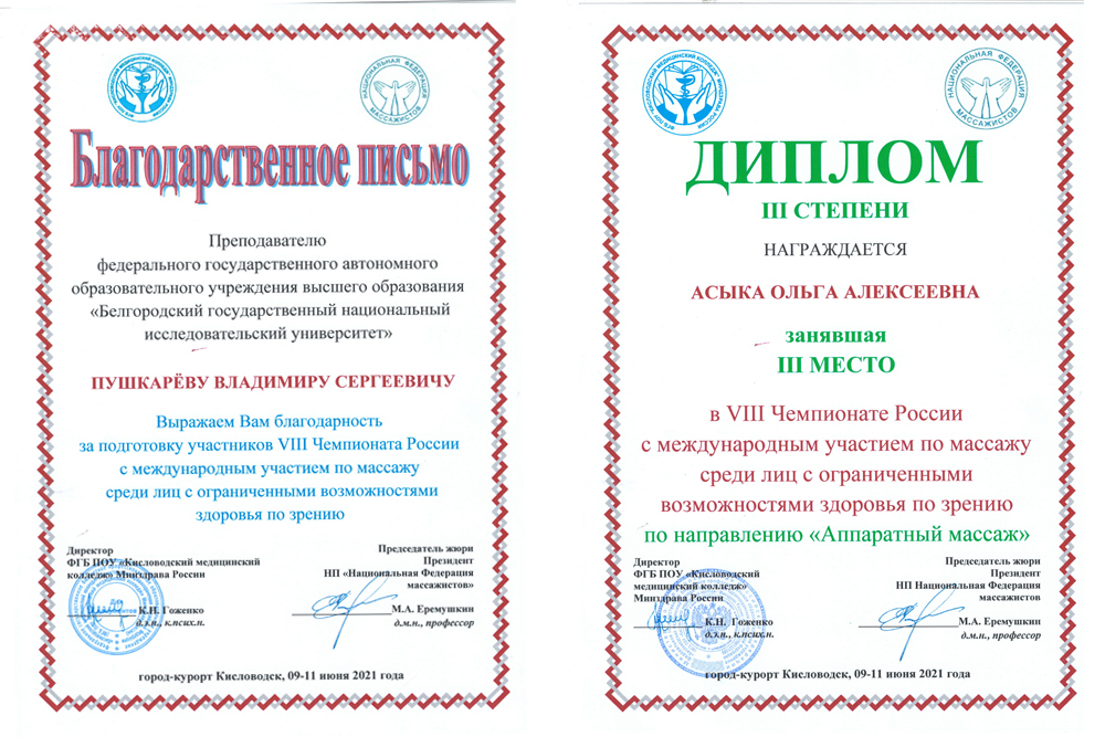 Медицинский колледж медицинского института НИУ «БелГУ» представили студенты 2 курса специальности 34.02.02 Медицинский массаж (для обучения лиц с ОВЗ по зрению) Константин Кахтур и Ольга Асыка. В течение трёх дней молодые люди демонстрировали свои навыки в обязательной (классический массаж) и произвольной программах. Белгородцы выступили в номинациях: спортивный массаж, аппаратный массаж, классический массаж. По итогам мероприятия Константин Кахтур занял 2 место по направлению «Спортивный массаж», а Ольга Асыка удостоилась 3 места по направлению «Аппаратный массаж».