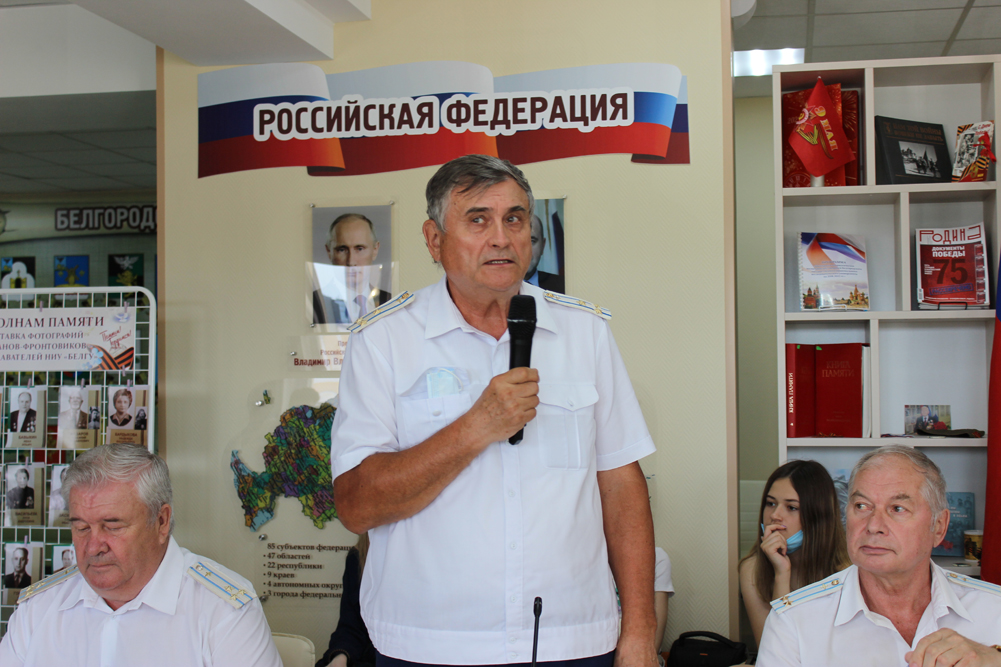 В Центре гражданско-патриотического воспитания обучающихся университета встретились представители всех студенческих активов институтов, а также почетные гости мероприятия – председатель Совета ветеранов войны и труда НИУ «БелГУ» Юрий Питинов, представители вооружённых сил России в отставке: заместитель командира дивизии Военно-транспортной авиации, Заслуженный военный лётчик Российской Федерации, кавалер ордена «За службу Родине», полковник Владимир Осиков, командир истребительного авиационного полка, лётчик первого класса, кавалер ордена «Красная Звезда», медали «За Боевые Заслуги» полковник Владимир Баштовой, командир истребительного авиационного полка, лётчик первого класса, кавалер ордена «Красная Звезда» полковник Владимир Черенков, командир авиационной эскадрильи, лётчик-инструктор первого класса, подполковник Александр Авраменко, командир авиационного отряда, Заслуженный пилот России Вячеслав Малец и участник боевых действий в Афганистане, лётчик-инструктор на планерах, руководитель военно-патриотического клуба при ДОСААФ Белгородской области, кавалер ордена «За службу Родине» капитан Ярослав Миронюк.