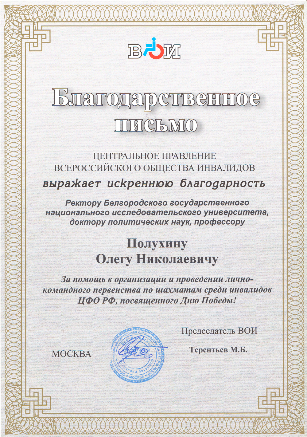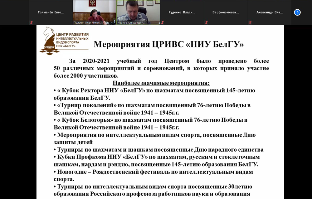 Об итогах и перспективах работы Центра развития интеллектуальных видов спорта рассказал директор, международный гроссмейстер Александр Иванов. По словам Александра Александровича, Центр провёл более 50 соревнований, участниками которых стали свыше 2000 человек. Международный гроссмейстер отметил растущую популярность как шахмат, так и других интеллектуальных игр – го, рэндзю, стоклеточных шашек. Однако из-за пандемии многие турниры пришлось перевести в онлайн-формат. Александр Александрович поблагодарил руководство НИУ «БелГУ», профсоюзный комитет, Молодёжный культурный центр, Центр адаптивного спорта и администрацию города Белгорода за оказанную поддержку в проведении соревнований и зачитал благодарственное письмо, пришедшее в адрес ректора НИУ «БелГУ», профессора Олега Полухина от центрального правления Всероссийского общества инвалидов.