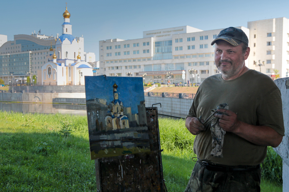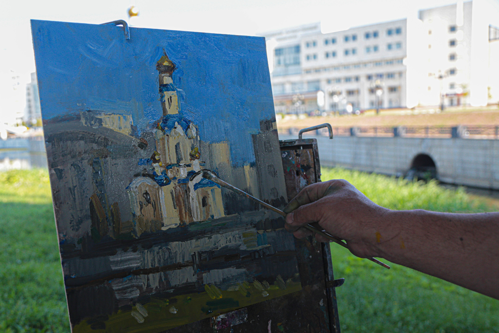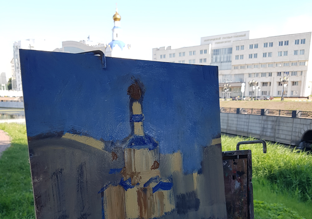 – Здесь неподалёку мой дом. Проезжая мимо, постоянно засматриваюсь на эти виды. Храм, заводь за мостом и возвышающиеся над рекой многоэтажки… Каждый раз ловил себя на мысли, что всю жизнь живу в Белгороде, но до сих пор не разу не писал городских пейзажей…, – пояснил художник.