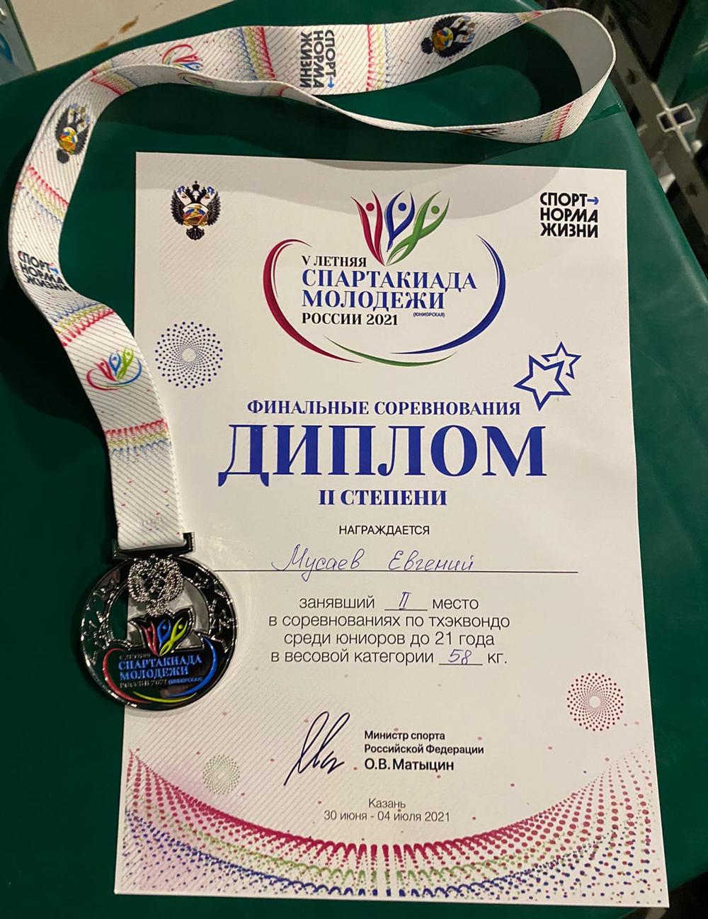 Соревнования в разных видах спорта прошли в Казани. Студент факультета физической культуры педагогического института НИУ «БелГУ» Евгений Мусаев завоевал серебро в тхэквондо (в весовой категории до 58 кг), уступив только спортсмену из г. Шахты Дмитрию Шишко.