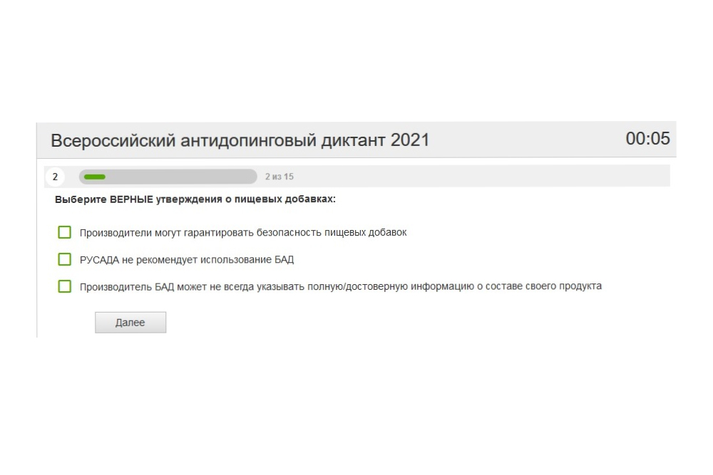 Для прохождения теста необходимо было ответить на 15 вопросов диктанта. При подготовке можно было воспользоваться записями лекций, размещенных на официальном канале РУСАДА на Youtube-канале.