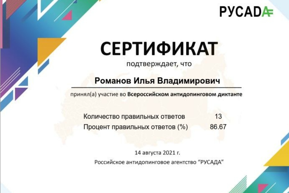 Все успешно прошедшие тест получили памятный сертификат об участии во «Всероссийском антидопинговом диктанте» при поддержке движения «Россия без допинга».