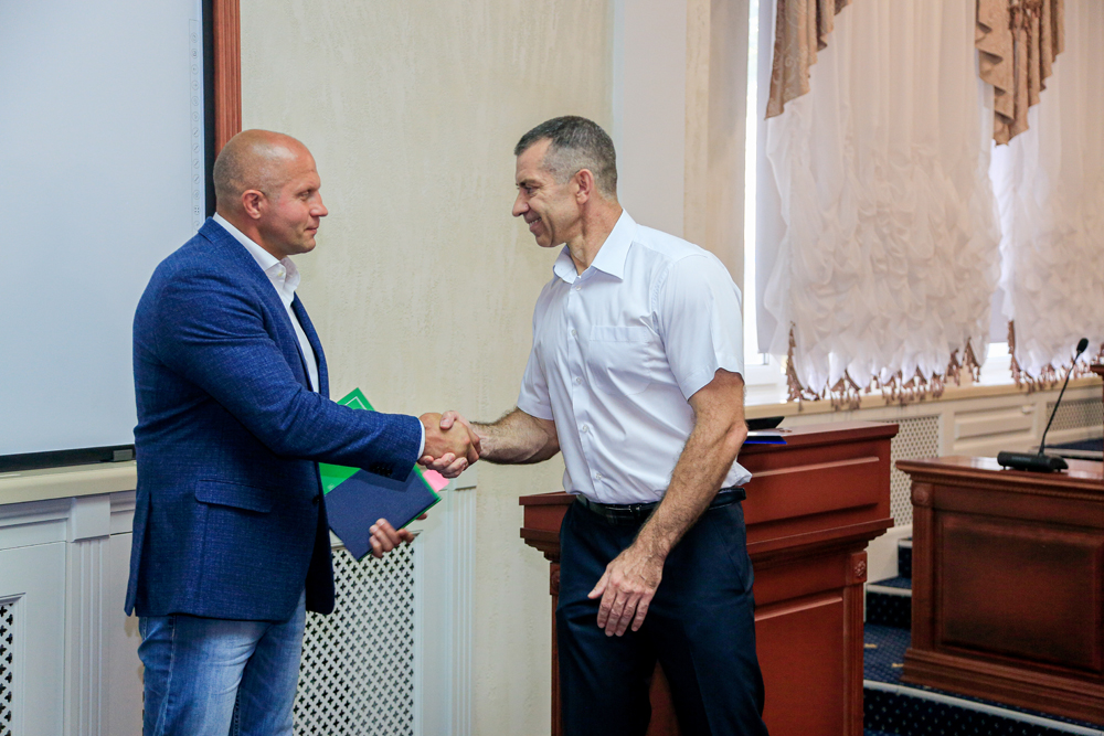 – Я благодарен родному филиалу за создание кафедры педагогики и физической культуры, именной аудитории и, думаю, что в ближайшее время мы попросим создать там кафедру смешанных единоборств. Потому что ребята, которые у нас успешно выступают на чемпионатах страны, Европы, мира, все себя реализуют, все являются выпускниками или студентами нашего университета, – заметил Фёдор Владимирович.
