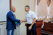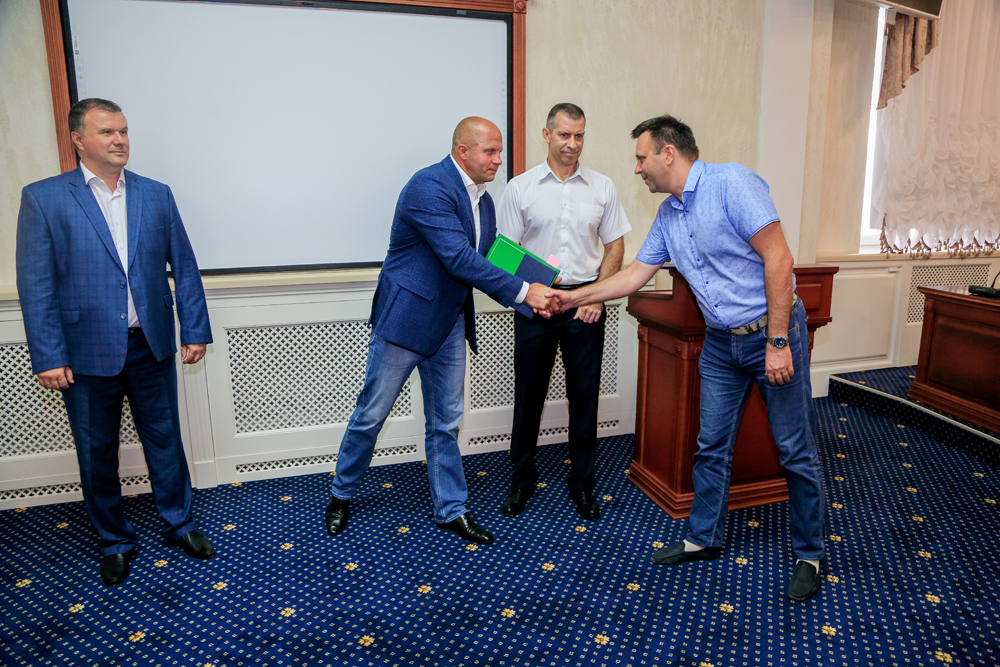 Диплом об окончании аспирантуры многократному чемпиону мира по смешанным единоборствам Фёдору Емельяненко вручил проректор по образовательной деятельности НИУ «БелГУ» Александр Маматов, пожелав дальнейших спортивных побед и побед на научном поприще. Александр Васильевич презентовал почётному выпускнику сборник «Старт в профессию», рассказывающий об именных и тематических аудиториях НИУ «БелГУ», в том числе и об аудитории, которая в честь самого прославленного спортсмена была открыта в Старооскольском филиале вуза пять лет назад.