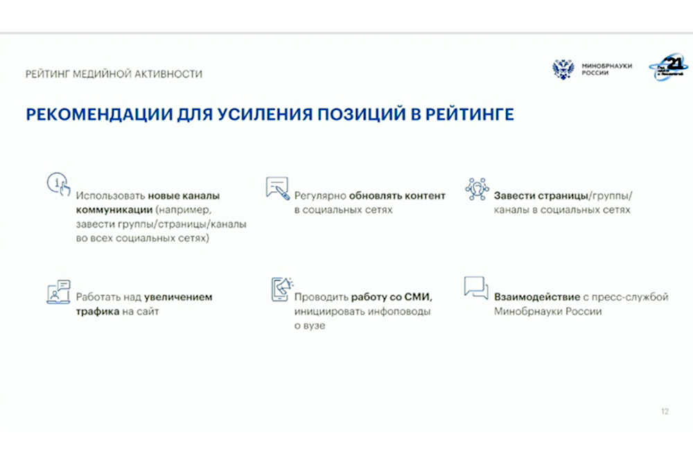 Данный рейтинг медийной активности вузов составлен по итогам исследования за июль 2021 года, отметила замминистра, и будет обновляться и публиковаться на сайте Минобрнауки ежемесячно. Важно, по словам Елены Дружининой, продемонстрировать не столько уже имеющийся на данный момент результат, сколько динамику роста.