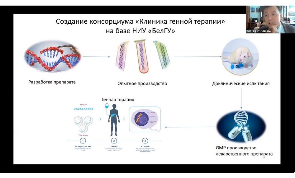 В частности, речь шла о создании на базе НИУ «БелГУ» клиники генной терапии – проект представил руководитель объединённого центра генетических технологий НИУ «БелГУ» Алексей Дейкин.