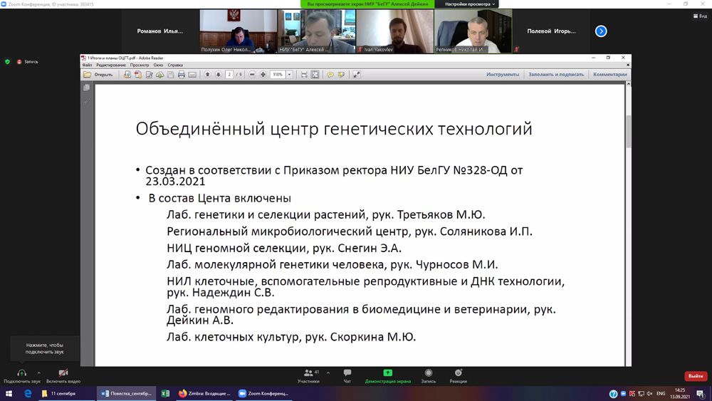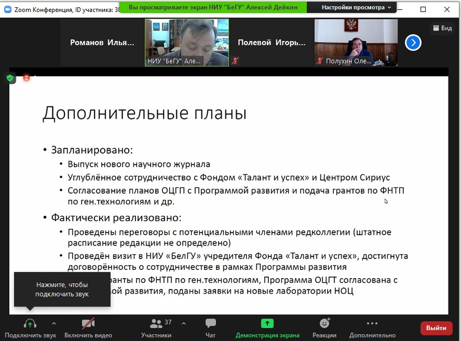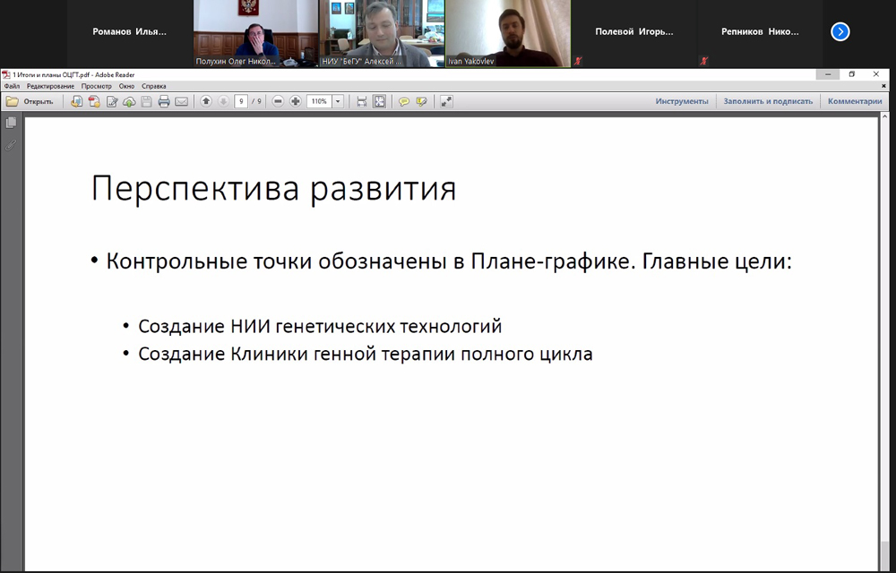На заседании Совета, которое прошло под председательством ректора НИУ «БелГУ», профессора Олега Полухина в дистанционном формате, подвели промежуточные итоги деятельности Объединенного центра генетических технологий и рассмотрели перспективы его развития. Руководитель центра Алексей Дейкин отметил, что главной целью является создание НИИ генетических технологий и клиники генной терапии полного цикла. По словам молодого учёного, на сегодняшний день уже немало сделано, но многое ещё предстоит. Ректор попросил активизировать работу и, актуализировав «дорожную карту», создать реестр проблемных вопросов с конкретными предложениями и сроками их решения. Генеральный директор ООО «Генотаргет» Иван Яковлев, выступивший содокладчиком, озвучил возможные сферы сотрудничества с Объединённым центром генетических технологий НИУ «БелГУ».