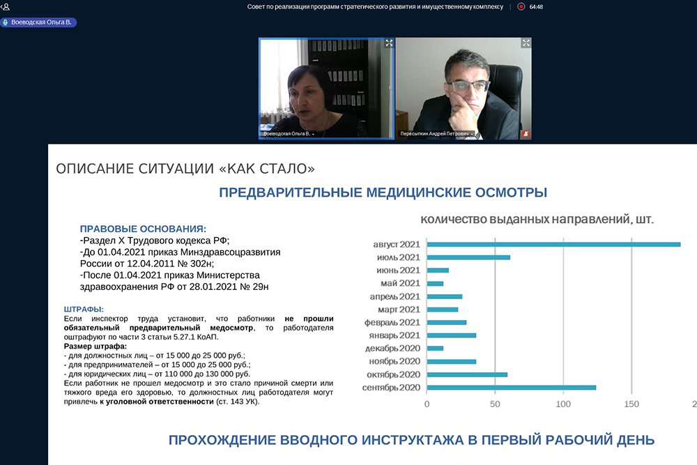Начальник отдела охраны труда Ольга Воеводская сообщила о нововведениях при приёме на работу, в том числе о медосмотре новых работников. Речь шла о первичном обучении по охране труда. По словам руководителя проектного офиса Светланы Гайворонской, проект нужно признать успешным. О его положительных результатах говорит факт отсутствия травматизма на рабочих местах.