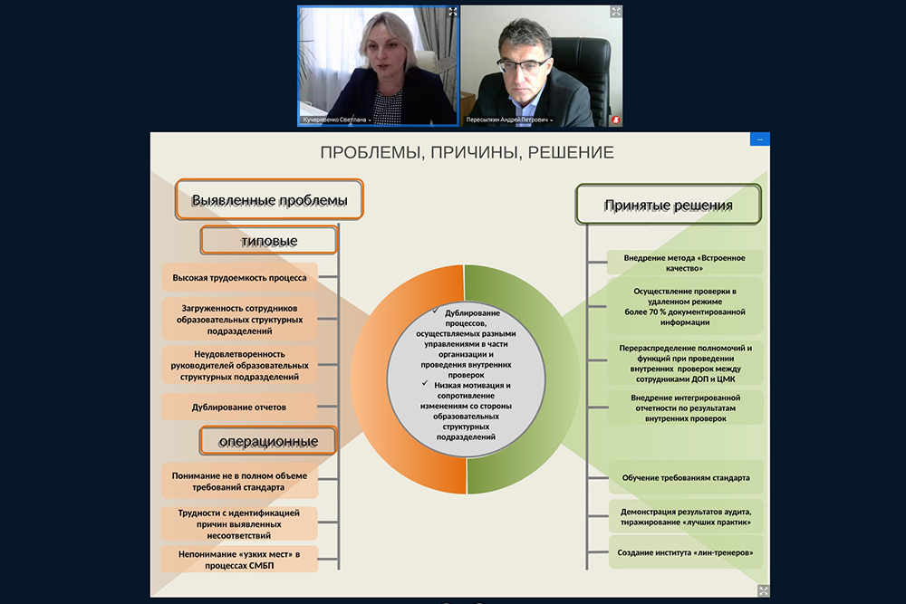 Как отметила Светлана Алексеевна, особенностью проекта является оптимизация сразу трёх процессов: внутреннего аудита системы менеджмента качества, системы бережливого производства и внутривузовской аккредитации образовательных программ.