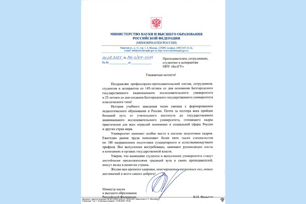 Валерий Фальков направил поздравительное письмо в адрес профессорско-преподавательского состава, сотрудников, студентов и аспирантов Белгородского госуниверситета