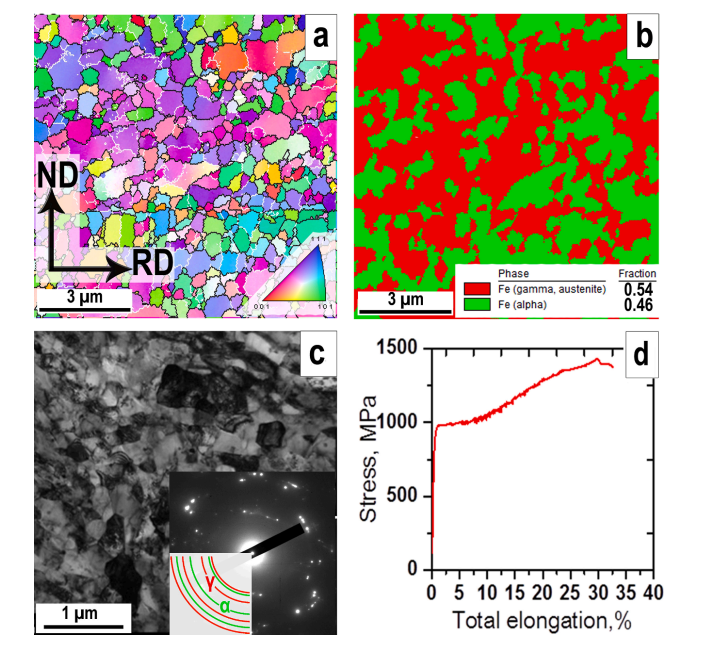 Учёные изучили структуру среднемарганцевой стали и провели серию испытаний для изучения её физических свойств. Исследователи обнаружили, что материал демонстрирует превосходные механические свойства: высокий предел текучести 920 МПа, предел прочности при растяжении 1440 МПа и относительное удлинение, составившее 32%.
