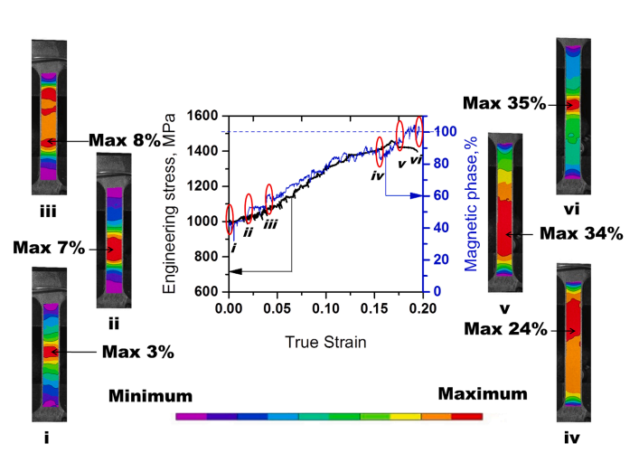 Кроме того, была обнаружена почти линейная зависимость между фазовым превращением и истинной деформацией. Как отмечает ведущий научный сотрудник, доктор физико-математических наук Андрей Беляков, эта взаимосвязь позволяет использовать долю мартенсита, вызванного деформацией, в качестве индикатора общей деформации несущих конструкций. Система датчиков, осуществляющих дистанционный контроль состояния несущих конструкций, будет востребована в различных областях промышленности и строительства, например, для мониторинга труднодоступных элементов напряжённой конструкции танкеров.