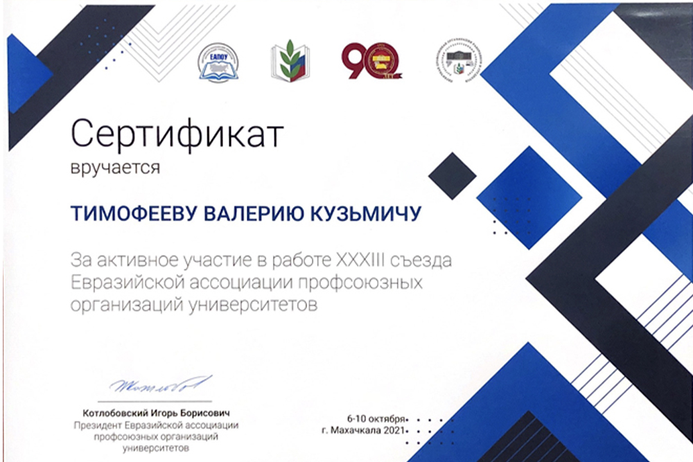 ХХХIII съезд Евразийской ассоциации профсоюзных организаций университетов (ЕАПОУ) состоялся в Дагестанском государственном университете, отметившим в эти дни своё 90-летие. В форуме приняли участие представители 47 университетов из семи стран СНГ: Казахстана, Армении, Беларуси, Украины, России, Киргизии и Молдавии.