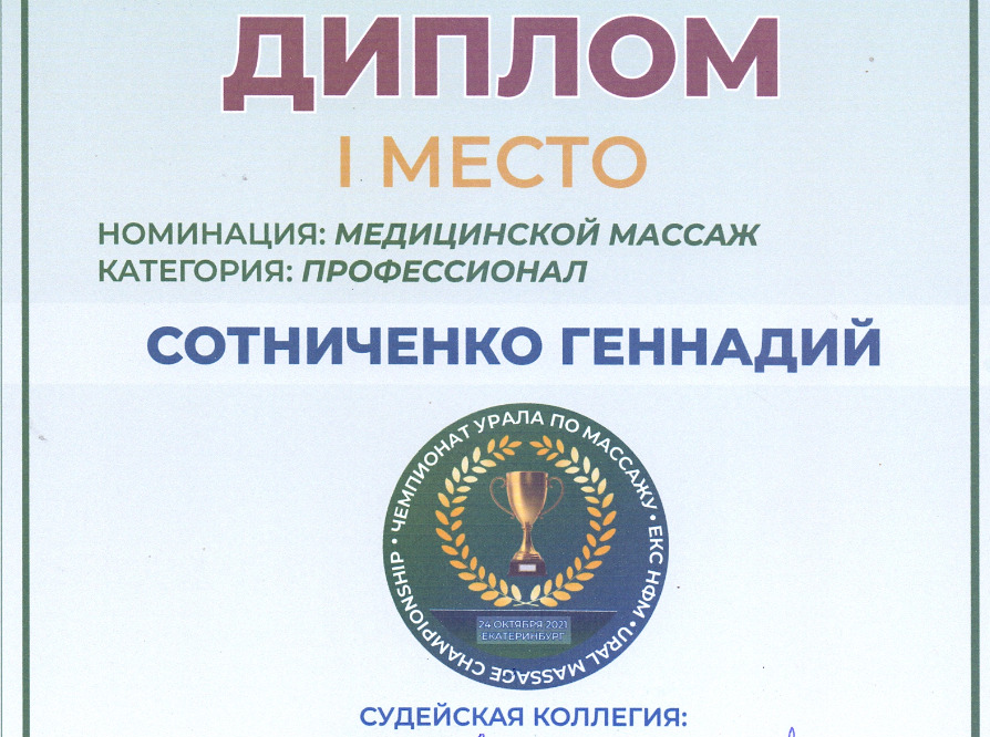 V открытый чемпионат Урала по массажу проходил в Екатеринбурге. В нём приняли участие специалисты из разных регионов страны. Преподаватель медицинского колледжа медицинского института НИУ «БелГУ» Геннадий Сотниченко стал победителем в категории «Профессионал», обеспечив себе участие в XIV чемпионате России по массажу, который пройдёт в декабре 2021 года в Нижнем Новгороде.