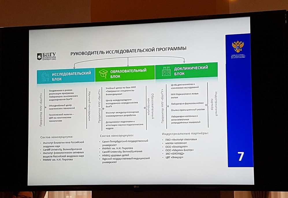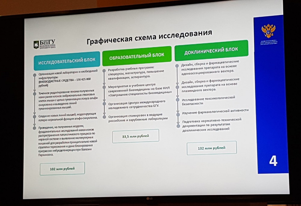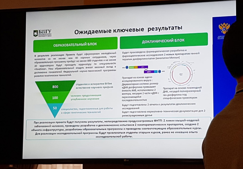 Рассказывая о первоочередных задачах, руководитель проекта – профессор Кардиффского университета Владимир Бухман, отметил, что в планах на ближайшую перспективу – открытие лаборатории моделирования и генной терапии заболеваний человека, а также создание линейки гуманизированных мышей, способных продуцировать белок человека – альфа-синуклеин. Это необходимо для создания геннотерапевтических препаратов, направленных на лечение социально значимых генетических заболеваний, прежде всего болезни Паркинсона (при её ранней диагностике) и одной из наиболее распространённых мышечных дистрофий – дисферлинопатии. При этом особое внимание будет уделено развитию образовательного блока. Наряду с образовательными программами и спецкурсами в том числе с участием ведущих зарубежных учёных, предусмотрены стажировки и мастер-классы с вовлечением в исследовательский процесс студентов, магистрантов и аспирантов, а также создание на базе НИУ «БелГУ» образовательного Центра международного молодёжного сотрудничества.