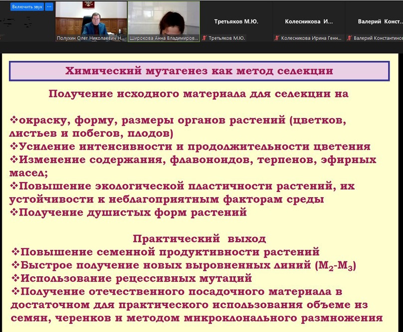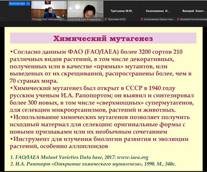 Работы в этом направлении будут проводиться в коллаборации с учёными лаборатории селекции и семеноводства зеленных, пряно-ароматических и декоративных культур ФГБНУ ФНЦО РАН (Федеральный научный центр овощеводства, г. Москва) и других ведущих селекционных центров страны. О преимуществах химического мутагенеза в селекции цветочно-декоративных и пряно-ароматических культур в своём докладе подробно рассказала старший научный сотрудник данной лаборатории Анна Широкова, сделав акцент на городском озеленении. Исследователь заметила, что в современной городской архитектуре преобладают металл и пластик, а это, по её мнению, требует другого подхода к оформлению территорий и ландшафта.
