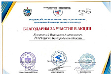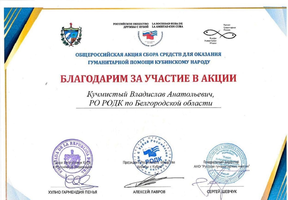 Добавим, что накануне проректор по международному сотрудничеству НИУ «БелГУ», сопредседатель Белгородского отделения Российского общества дружбы с Кубой Владислав Кучмистый получил Благодарность за участие в общероссийской акции по сбору средств для оказания гуманитарной помощи Кубе.