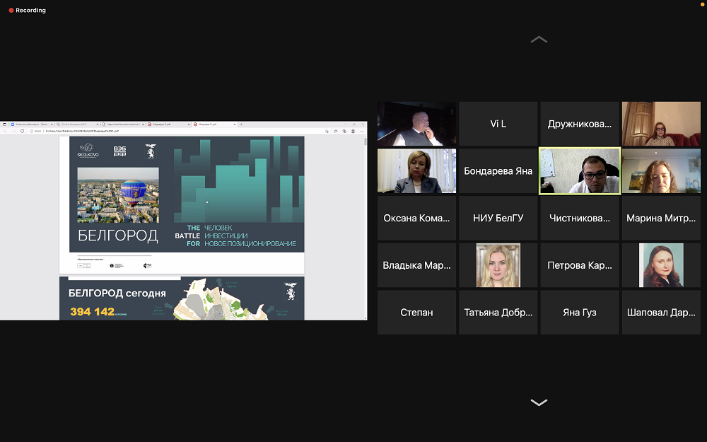 Одна из тем, связанных с новыми формами пространственной организации экономики, касалась Белгорода и Белгородской области. О практических рекомендациях по программе трансформации города Белгорода рассказал первый заместитель главы администрации городского округа по строительству, транспорту и жилищно-коммунальному хозяйству Олег Медведев. Особый интерес вызвали исследования докторантов кафедры Белгородского госуниверситета Яны Бондаревой и Юлии Лыщиковой, посвящённые методологии исследования сетевых структур пространственной интеграции экономики регионов и концепции «умного региона».