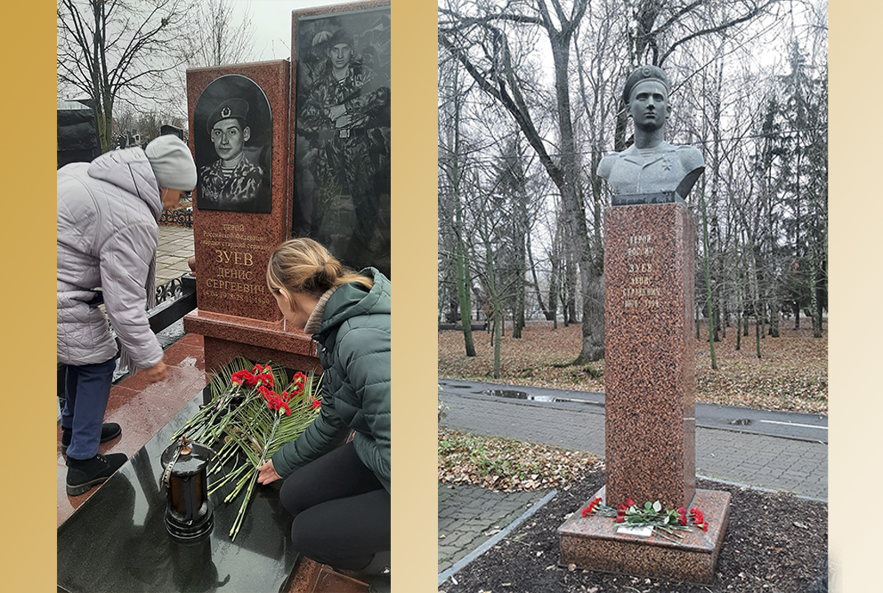 28 ноября, в день гибели Героя России Дениса Сергеевича Зуева, активисты Центра гражданско-патриотического воспитания НИУ «БелГУ» – обучающаяся факультета математики и естественнонаучного образования педагогического института Ольга Филимонова и студентка института межкультурной коммуникации и международных отношений Евгения Григорьянц – совместно с директором Центра Инной Кузнецовой приняли участие в памятном мероприятии с возложением цветов к бюсту Дениса Зуева на Аллее Героев в парке Победы и к его могиле.