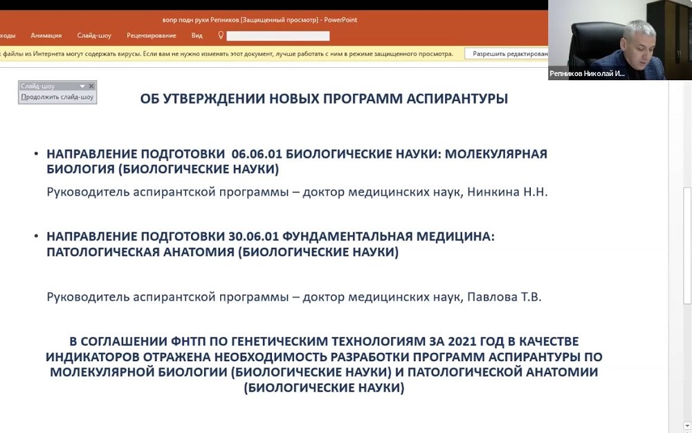 Вторым важным модулем программы развития генетических технологий является открытие новых образовательных программ. Первые две, которые будут реализованы на базе аспирантуры, утверждены на заседании учёного совета НИУ «БелГУ». Руководителем программы по направлению подготовки «Молекулярная биология» (06.06.01) станет доктор медицинских наук Наталья Нинкина, а по направлению «Патологическая анатомия» (30.06.01) – доктор медицинских наук Татьяна Павлова.