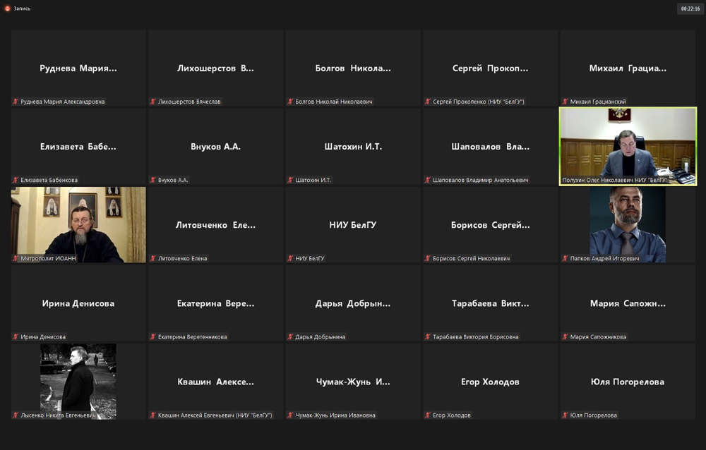 В заседании «Византийского клуба» в формате видеоконференции приняли участие Митрополит Белгородский и Староскольский Иоанн, ректор НИУ «БелГУ», профессор Олег Полухин и ответственный секретарь Национального комитета византинистов РФ Михаил Грацианский (МГУ им. М.В. Ломоносова). На встрече, которую вёл координатор клуба, профессор кафедры всеобщей истории НИУ «БелГУ» Николай Болгов, на примере Сербии обсудили историю взаимоотношений государства и Церкви, сохранение единства православия.