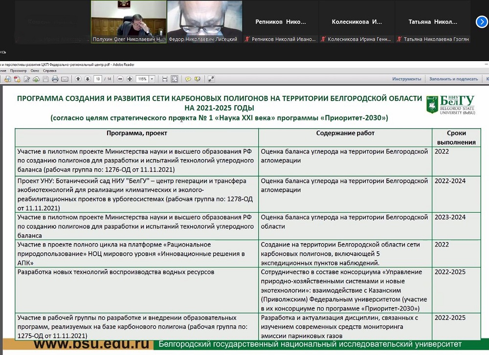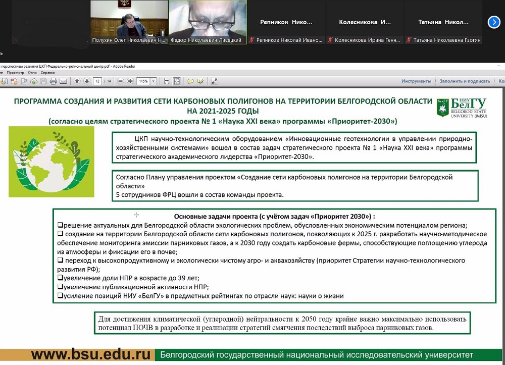 Как подчеркнул Фёдор Николаевич, это создаёт основу для эффективной реализации программы создания и развития сети карбоновых полигонов на территории Белгородской области на 2021-2025 годы и участия в проекте полного цикла на платформе «Рациональное природопользование» НОЦ мирового уровня «Инновационные решения в АПК» в части создания полигонов для разработки и испытаний технологий углеродного баланса, реализации климатических и эколого-реабилитационных проектов в урбогеосистемах, разработки теории и технологий оптимизации землепользования, направленных на максимальное увеличение запасов органического углерода в почве и сокращение выбросов парниковых газов, разработки новых технологий воспроизводства водных ресурсов.