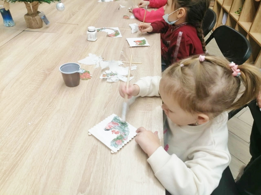 Первый мастер-класс «Шерстяная акварель» в период новогодних праздников подарили детям преподавателей вуза сотрудники Белгородского государственного музея народной культуры. В ходе занятия, развивающего мелкую моторику, дети пробовали рисовать шерстью: на плотном картоне выкладывали из волокон окрашенной шерсти ёлочные ветви, украшенные новогодней игрушкой. На следующем занятии ребята изготовили подставки из деревянных палочек, которые затем покрыли акриловой краской и нанесли салфетку с изображением снегиря в технике декупаж. В завершение изделие украсили крупными блёстками. Как сообщил председатель Профкома НИУ «БелГУ» Валерий Тимофеев, творческий марафон для детей членов профсоюзной организации продолжится: в течение месяца в музее народной культуры будут организованы два мастер-класса, пройдёт музейный квест, а также состоится знакомство с выставкой женских украшений.