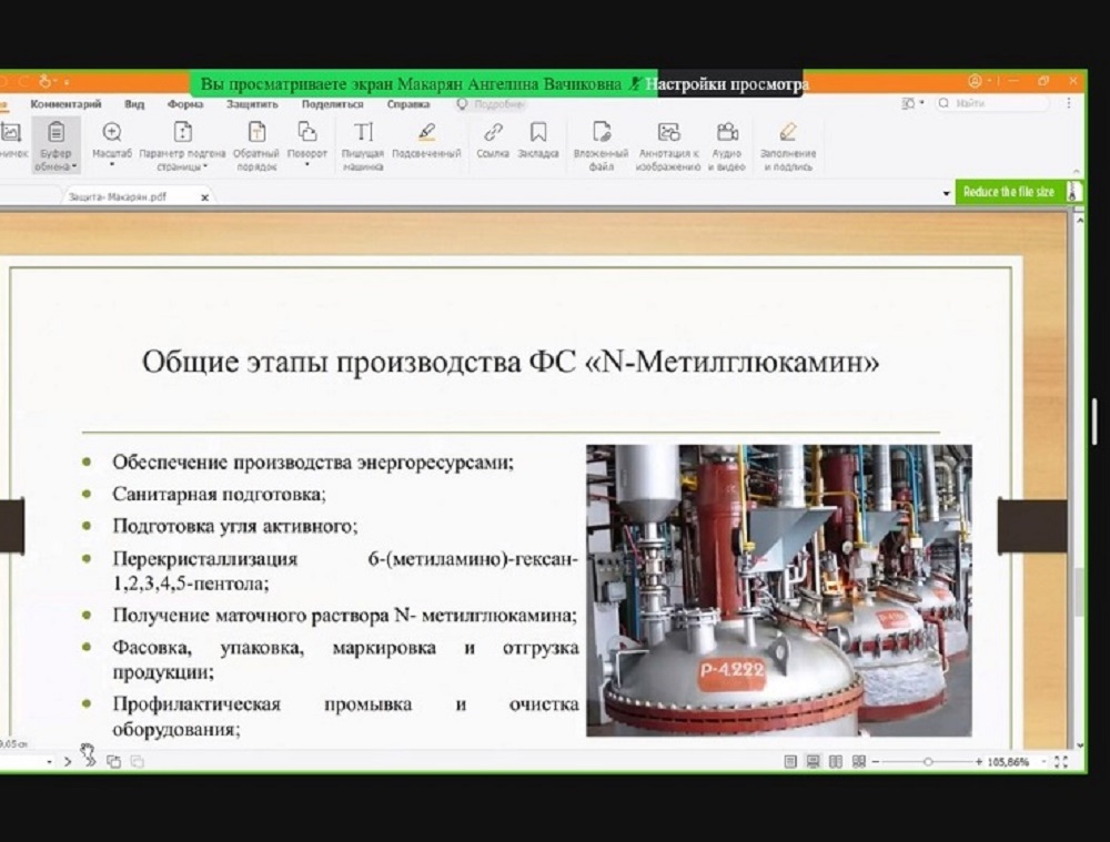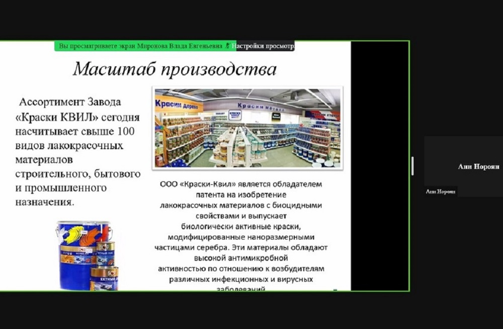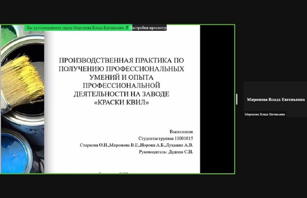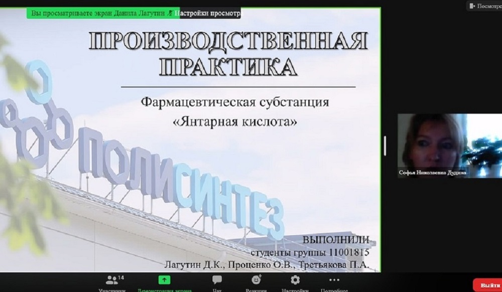 В завершении практики состоялась публичная защита в онлайн-формате, на которой студенты отчитались о результатах своей работы, активно обсудили возникшие вопросы по технике безопасности промышленных предприятий, технологические параметры химических процессов, особенности утилизации и переработки промышленных стоков и отходов и в целом тему экологической безопасности.
