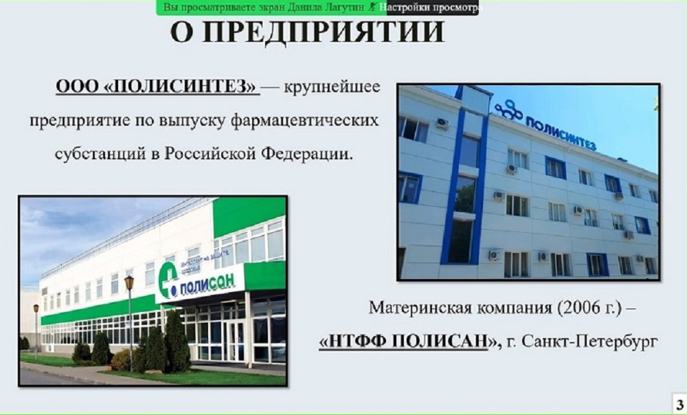 Студенты узнали, что на производстве ООО «Полисинтез» выпускают такие соединения, как аминокапроновая кислота, метилурацил, рибоксин, янтарная кислота, никотинамид, N-метилглюкамин, натрия ацетат тригидрат, L-яблочная кислота.