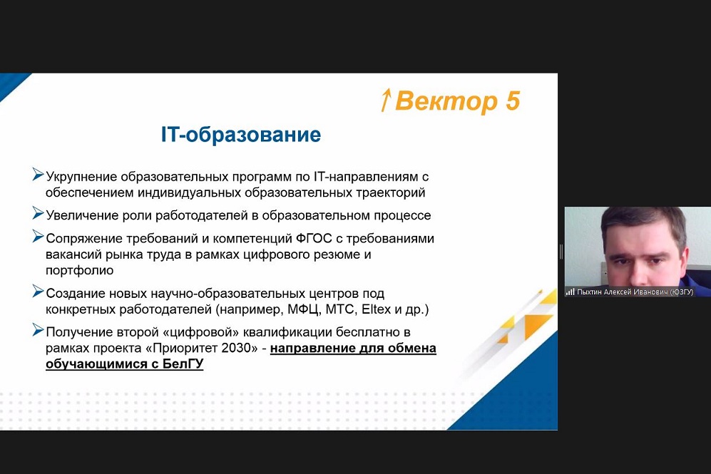 Стоит отметить, что в рамках программы «Приоритет-2030» в части развития цифровых технологий НИУ «БелГУ» планирует сотрудничать с Юго-Западным государственным университетом (г. Курск). По мнению сторон, обмен наработками и специалистами может повысить эффективность и ускорить сроки реализации проектов. Также в рамках сотрудничества предполагается обмен обучающимися для бесплатного получения второй «цифровой» квалификации.