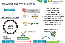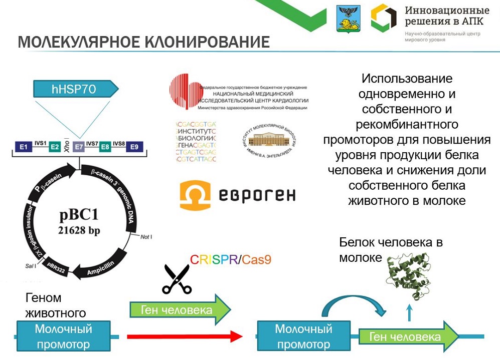 Учёный пояснил, что сама конструкция состоит из человеческого белка теплового шока, который встраивается в геном животного – в область молочного промотора. Её (конструкцию) разрабатывают учёные Национального медицинского исследовательского центра кардиологии совместно с коллегами из Института молекулярной биологии им. В.А. Энгельгардта на базе Института биологии гена. Финальный этап конструирования выполнит компания-партнёр «Евроген».