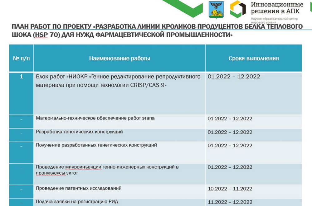 О задачах, которые стоят перед командой исследователей, разрабатывающих линию кроликов-продуцентов белка теплового шока (Hsp 70) для нужд фармацевтической промышленности, рассказал директор НИИ фармакологии живых систем НИУ «БелГУ», профессор Михаил Покровский. Опираясь на достигнутые результаты, учёные нацелены при помощи генного редактирования репродуктивного материала (используя технологию CRISPR/CAS 9) создать к концу 2022 года конструкцию для получения первых кроликов-продуцентов человеческого белка теплового шока. Выделять белок будут из молока генно-модифицированного животного. Как отметил Михаил Владимирович, все подготовительные работы были успешно выполнены в 2021 году.