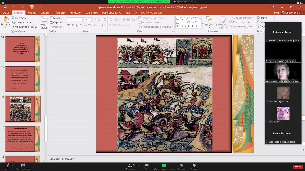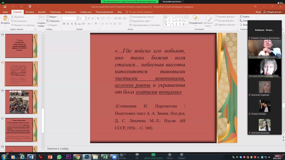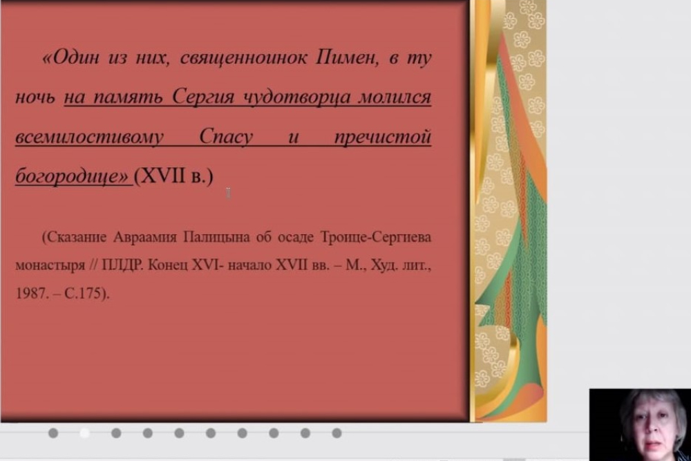В докладе кандидата филологических наук, доцента кафедры журналистики института общественных наук и массовых коммуникаций (ИОНиМК) Светланы Нарожней было предложено осмысление исторических и культурных предпосылок возникновения этой гражданской инициативы. Спикер отметила, что обращение к памяти воинов, погибших в сражениях за родную землю, – традиция, которая имеет многовековую историю, отражённую в произведениях древне- и старорусской литературы, в сочинениях русских авторов XVII века.