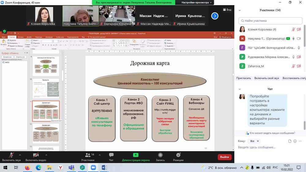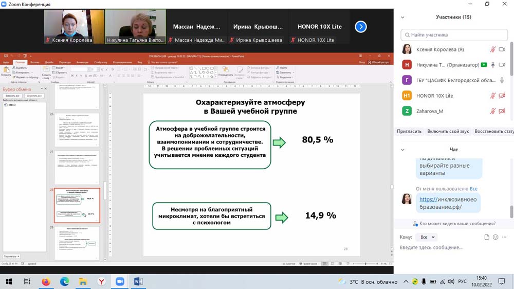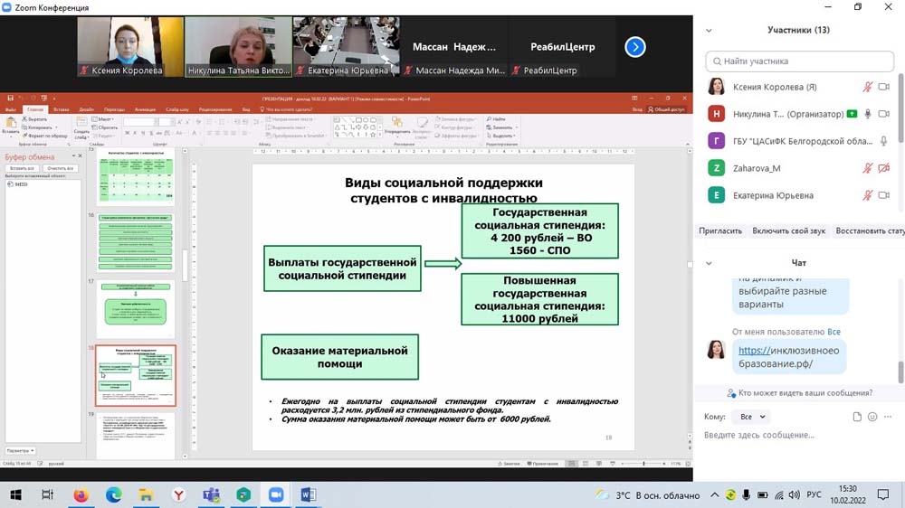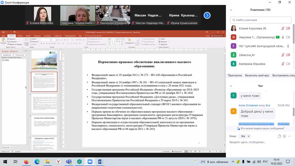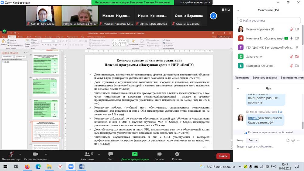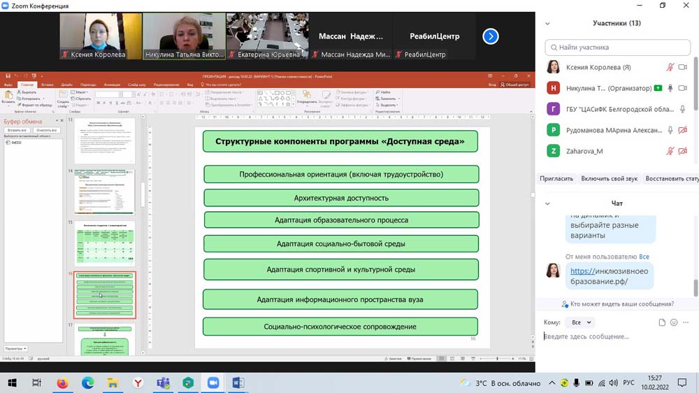 В рамках научного мероприятия директор департамента социальной политики НИУ «БелГУ», доцент кафедры социальной работы Татьяна Никулина провела методический семинар для преподавателей, кураторов, студентов и практических работников социальных служб региона по вопросам реализации инклюзивного подхода в учреждениях профессионального образования «Образование без ограничений: инклюзивная среда вуза». На семинаре обсуждались вопросы доступности профессионального образования для лиц с инвалидностью, рассматривались примеры создания современной инфраструктуры, обеспечивающей все нужды студентов с ограниченными возможностями здоровья, а также вопросы психологической и социальной адаптации студентов в коллективах.