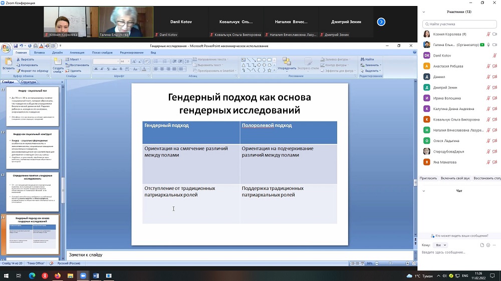 В институте общественных наук и массовых коммуникаций НИУ «БелГУ» состоялся мастер-класс доктора социологических наук, профессора кафедры социальной работы Галины Ельниковой, посвящённый Международному дню женщин и девочек в науке «Гендерные исследования в социологии». Студенты, аспиранты и преподаватели института приняли активное участие в обсуждении гендерного измерения неравенства в экономической, профессиональных и политической сферах, феминизации бедности в России. Были представлены результаты в контексте гендерных исследований острых социальных проблем таких, как семейное насилие, трансформация образов феминности и маскулинности в современном российском обществе, рост количества неполных, в том числе, отцовских семей, качество жизни мужчин и женщин с позиций гендерного подхода.