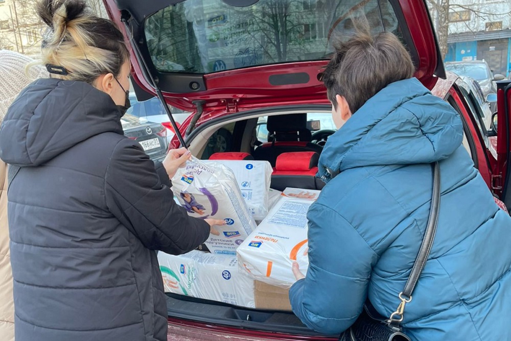 Актив добровольцев собрал первую партию помощи, в которую вошли средства гигиены, детские игрушки, новая одежда и чулочно-носочные изделия, детское питание, канцтовары.