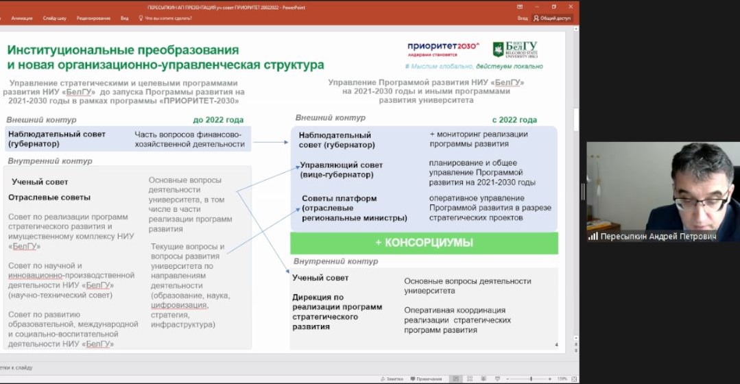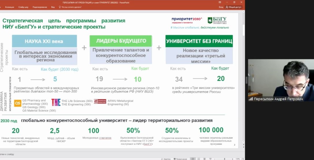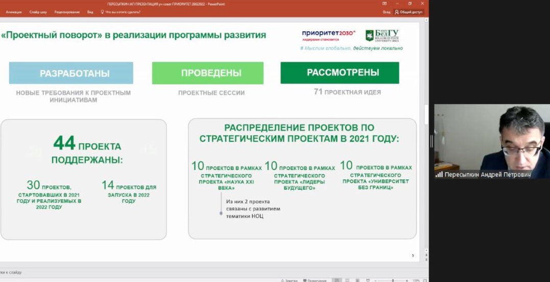 На заседании также были рассмотрены результаты реализации в 2021 году главной программы вуза – «Приоритет 2030» и проекты, запуск которых запланирован в 2022 году. Как рассказал проректор по реализации программ стратегического развития Андрей Пересыпкин, к реализации в 2021-2022 году уже одобрены и в основном реализуются 44 проекта, ещё 10-15 новых проектов планируется отобрать в течение текущего года. Об этом Андрей Петрович подробно рассказал на недавнем заседании областной Думы.