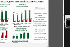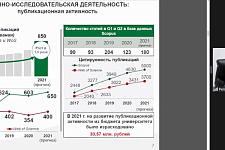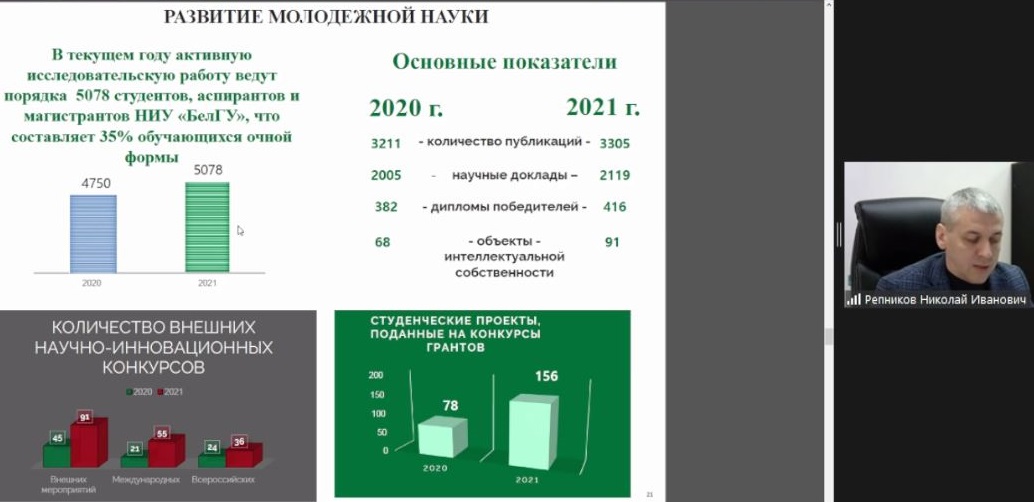 Говоря о молодёжной науке, Николай Иванович отметил, что в 2021 году исследованиями занимались порядка 5000 студентов, аспирантов и магистрантов университета. Результатом стали публикации 3350 статей, что превысило показатели предыдущего года.