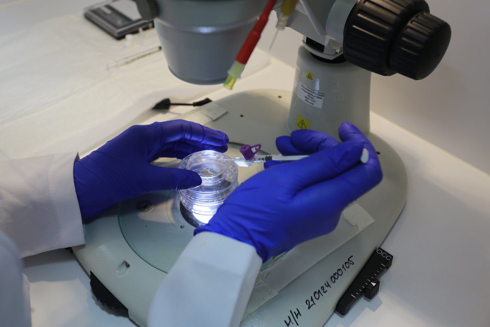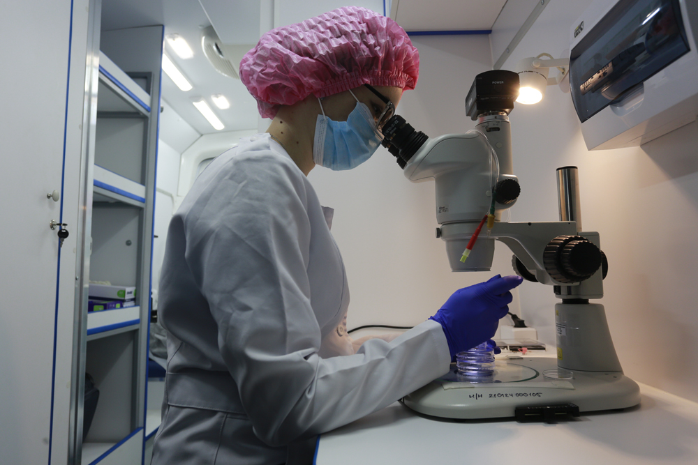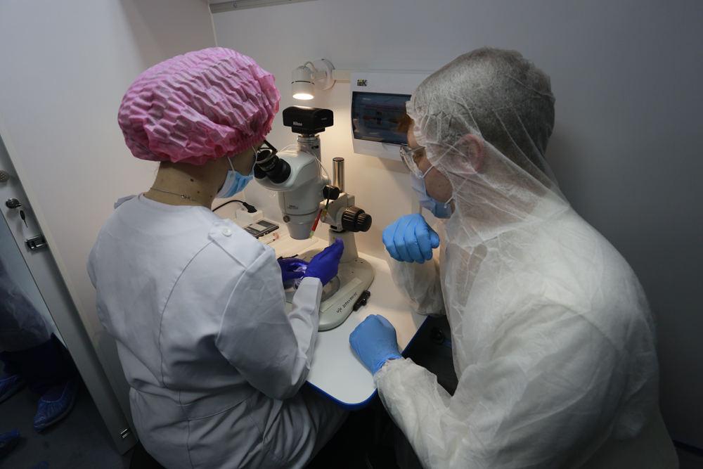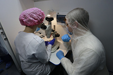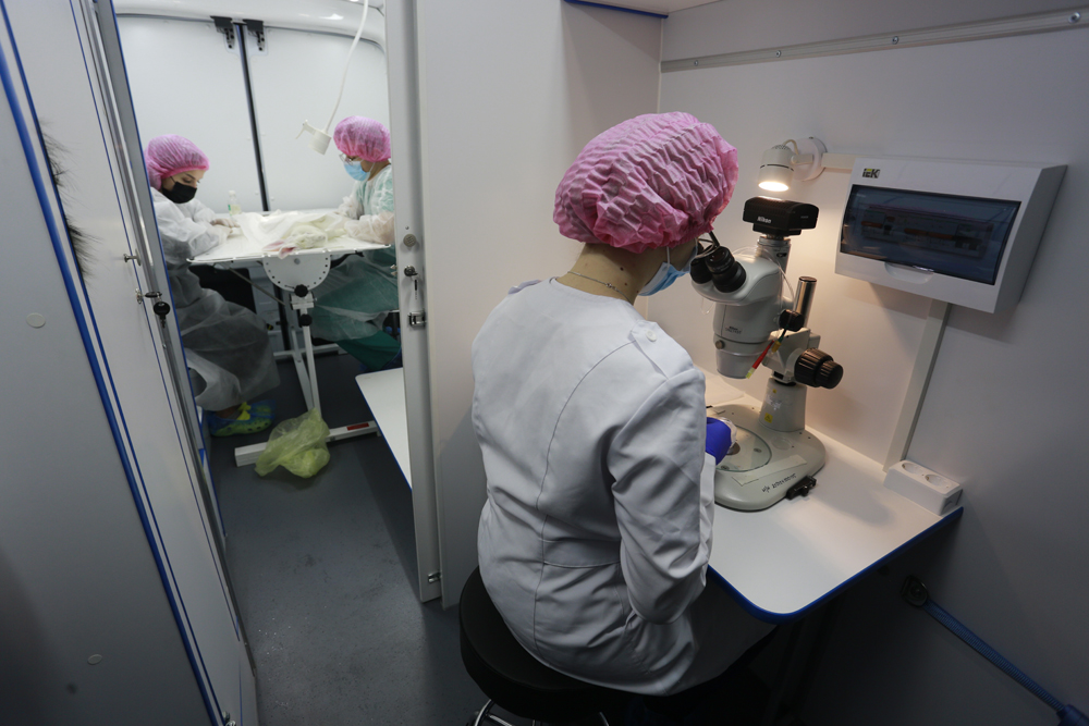 В мобильной лаборатории уже провели первые операции. В частности, отобрали эмбрионы у самок кролика породы хиколь и пересадили их другой самке.
