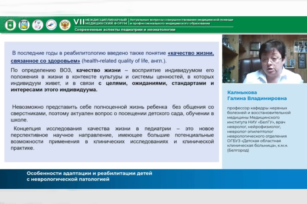 Темой доклада профессора кафедры нервных болезней и восстановительной медицины мединститута НИУ «БелГУ», к.м.н., Галины Калмыковой стали особенности адаптации и реабилитации детей с неврологическими патологиями.