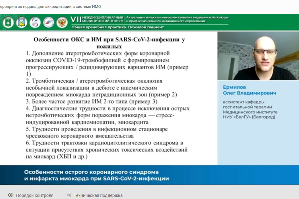 Профессор кафедры семейной медицины мединститута НИУ «БелГУ», д.м.н., Андрей Третьяков и аспирант этой же кафедры Олег Ермилов рассказали слушателям о необычных случаях течения COVID-19 у пожилых пациентов и об особенностях тромбофилического синдрома с полиорганной недостаточностью при ковиде в пожилом возрасте.