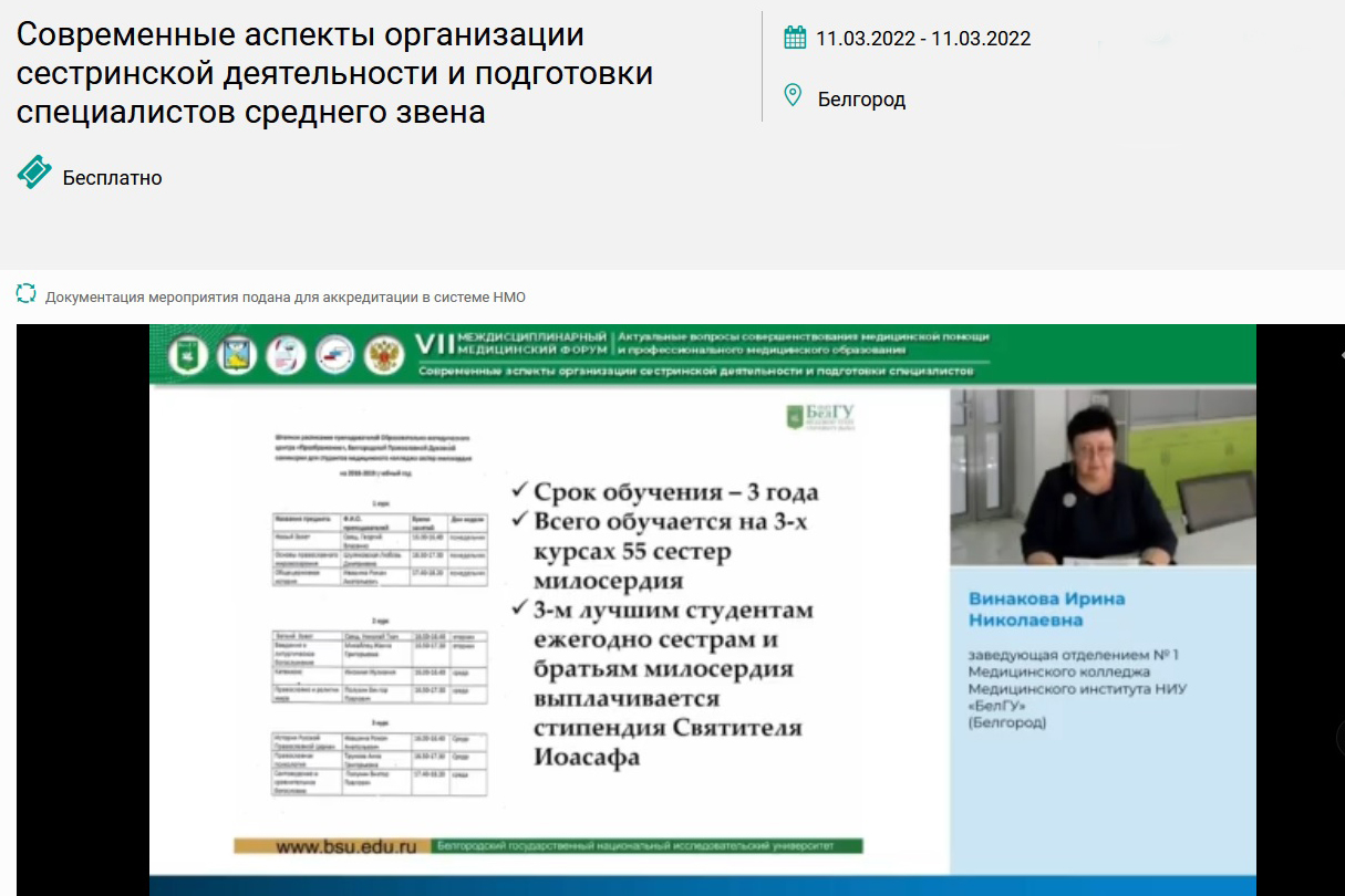 Также 11 марта работала секция, посвящённая современным аспектам организации сестринской деятельности и подготовки специалистов среднего звена. В ней приняли участие педагоги медицинского колледжа мединститута НИУ «БелГУ».